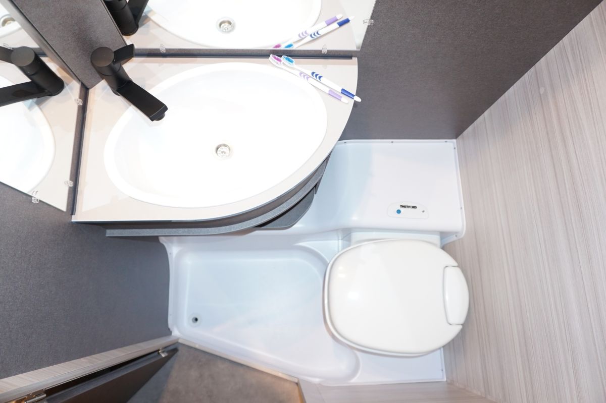 De aparte toiletruimte is netjes afgewerkt en voorzien van een vast toilet – handig en hygiënisch, waar je ook bent.