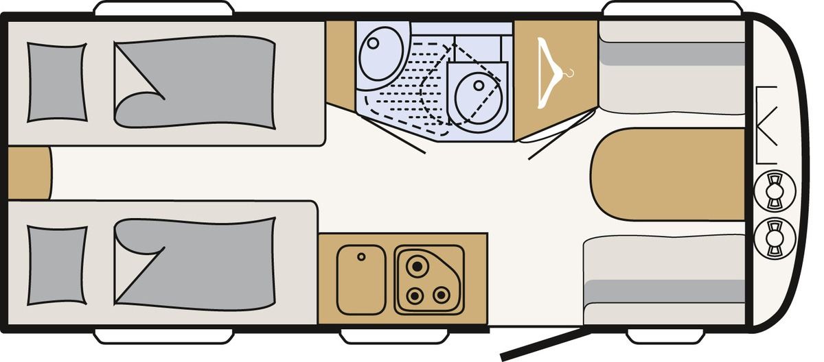 Achterin bevinden zich twee éénpersoonsbedden met bedombouw, waarmee je eenvoudig één groot tweepersoonsbed creëert. Onder de bedden is veel opbergruimte, bereikbaar van binnenuit én via het serviceluik buiten.