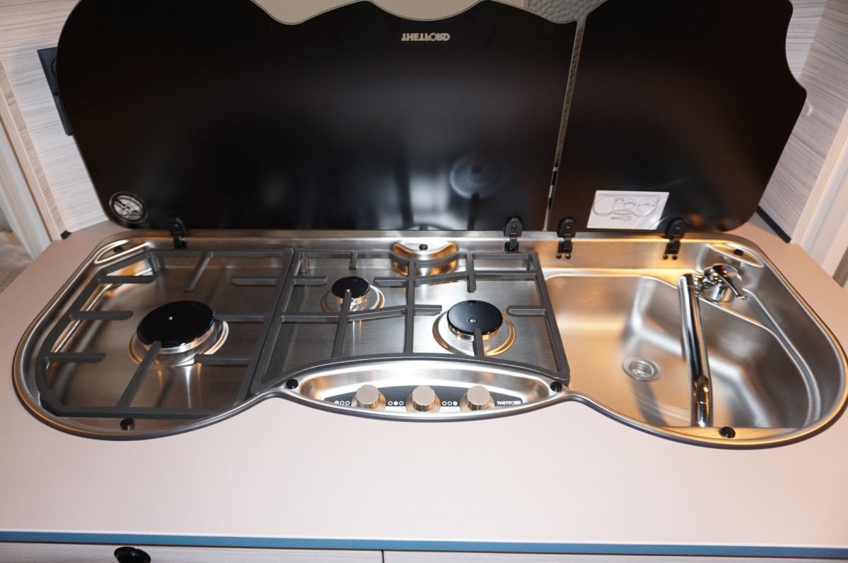 Een goed uitgeruste keuken met een 3-pits gasfornuis, een zeer grote koelkast en veel kastruimte voor al je keukengerei.
