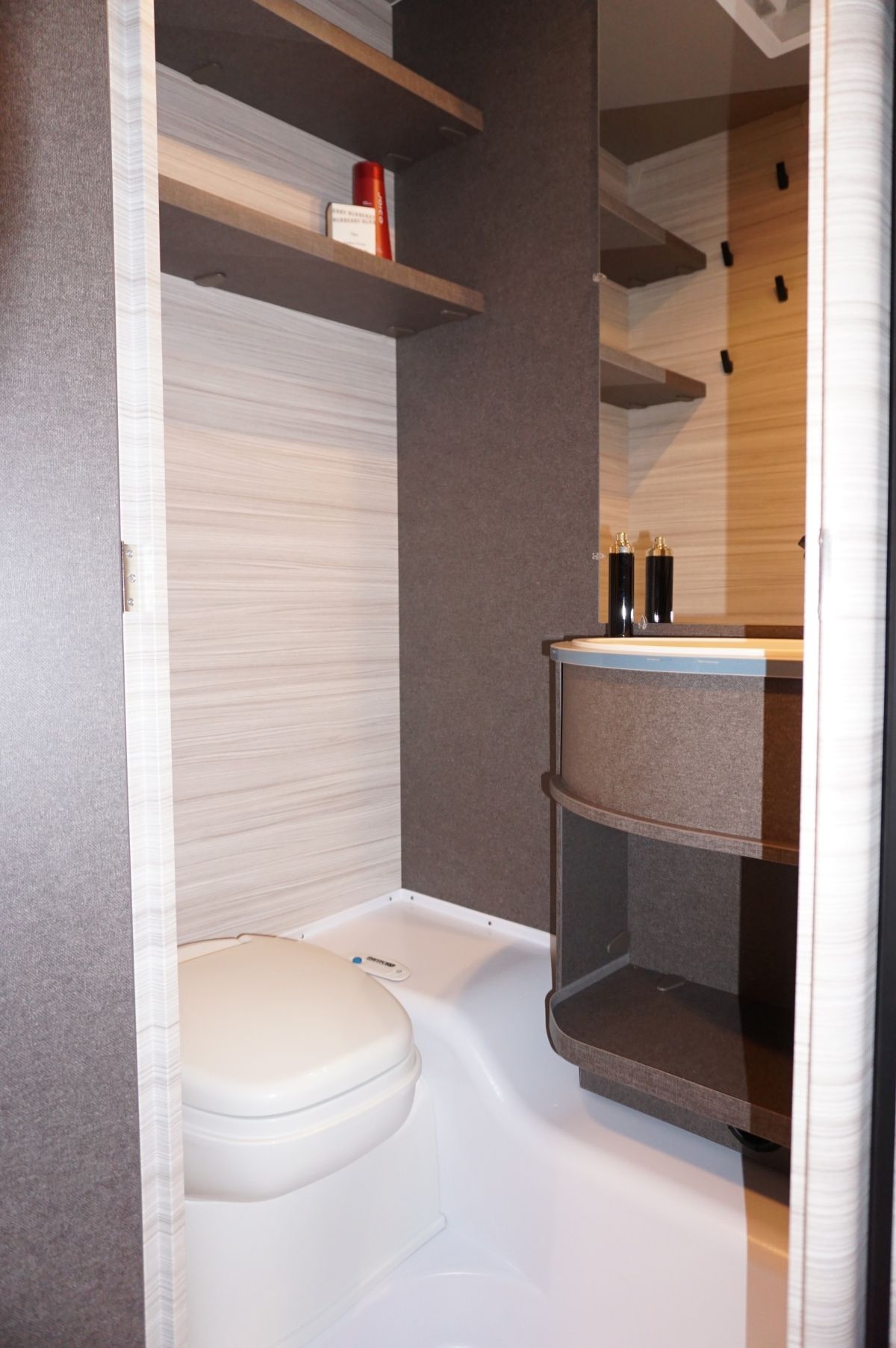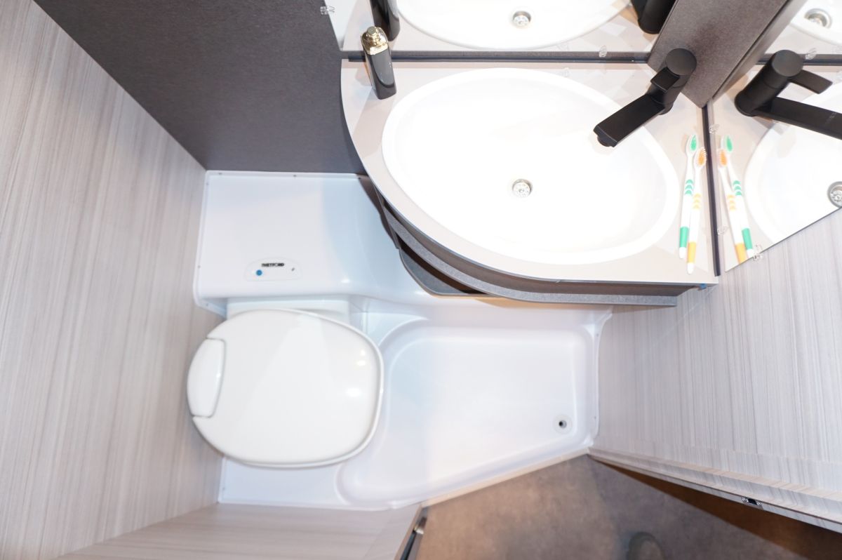 Een praktische toiletruimte met vast toilet – voor extra comfort en zelfstandigheid onderweg.
