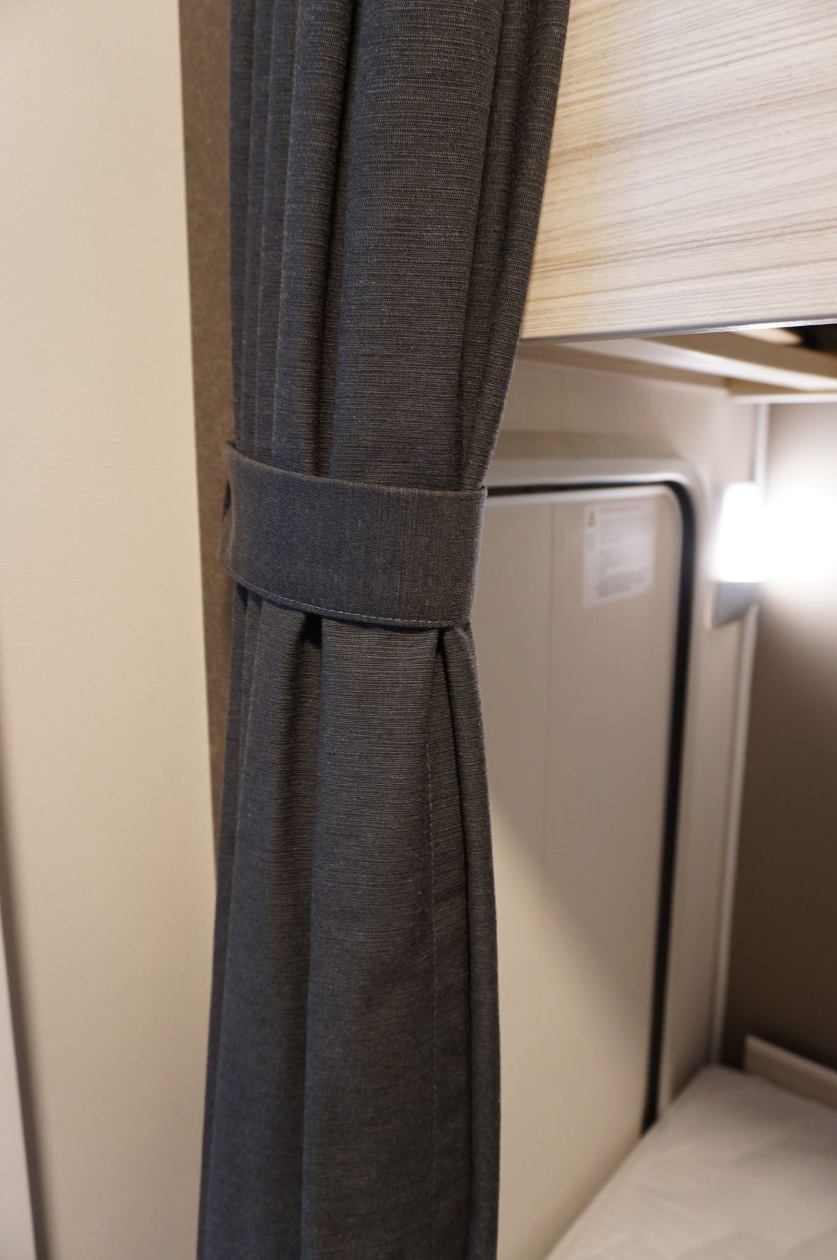 Een comfortabel dwars tweepersoonsbed met royale opbergruimte eronder, bereikbaar van binnenuit én via het serviceluik aan de buitenzijde.