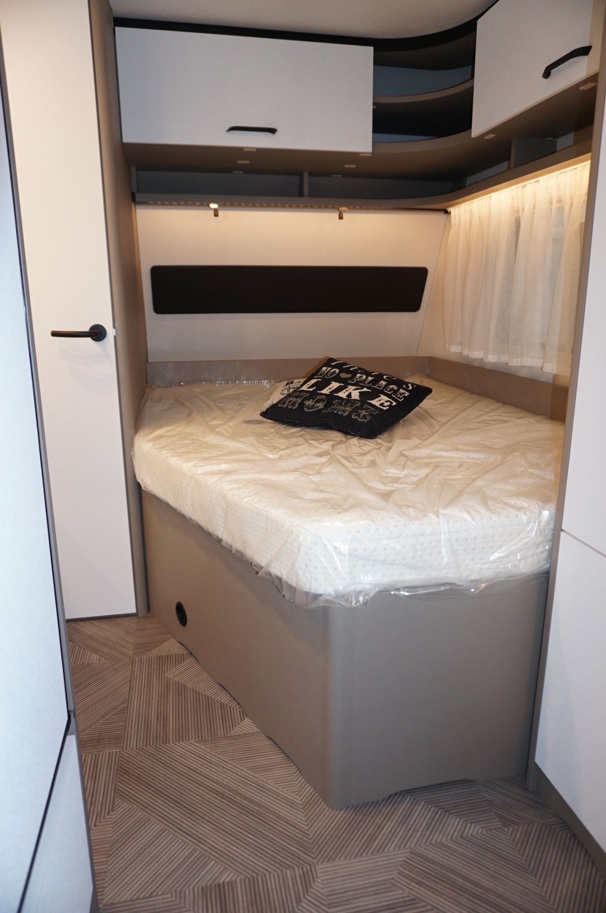 Comfortabel Frans bed met royale opbergruimte eronder, toegankelijk van binnenuit én via het serviceluik aan de buitenzijde.