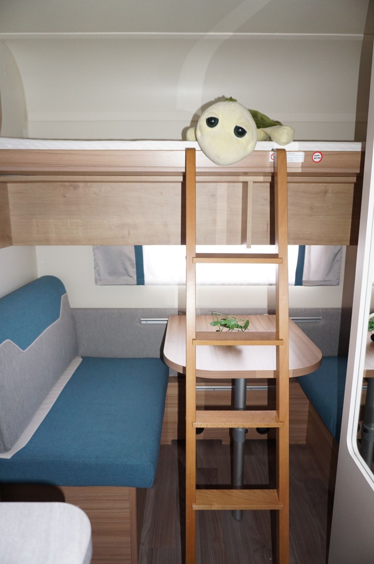 Achteraan bevindt zich een kleine zithoek voor twee personen, omvormbaar tot een éénpersoonsbed. Daarboven is een vast stapelbed voorzien – ideaal voor kinderen.