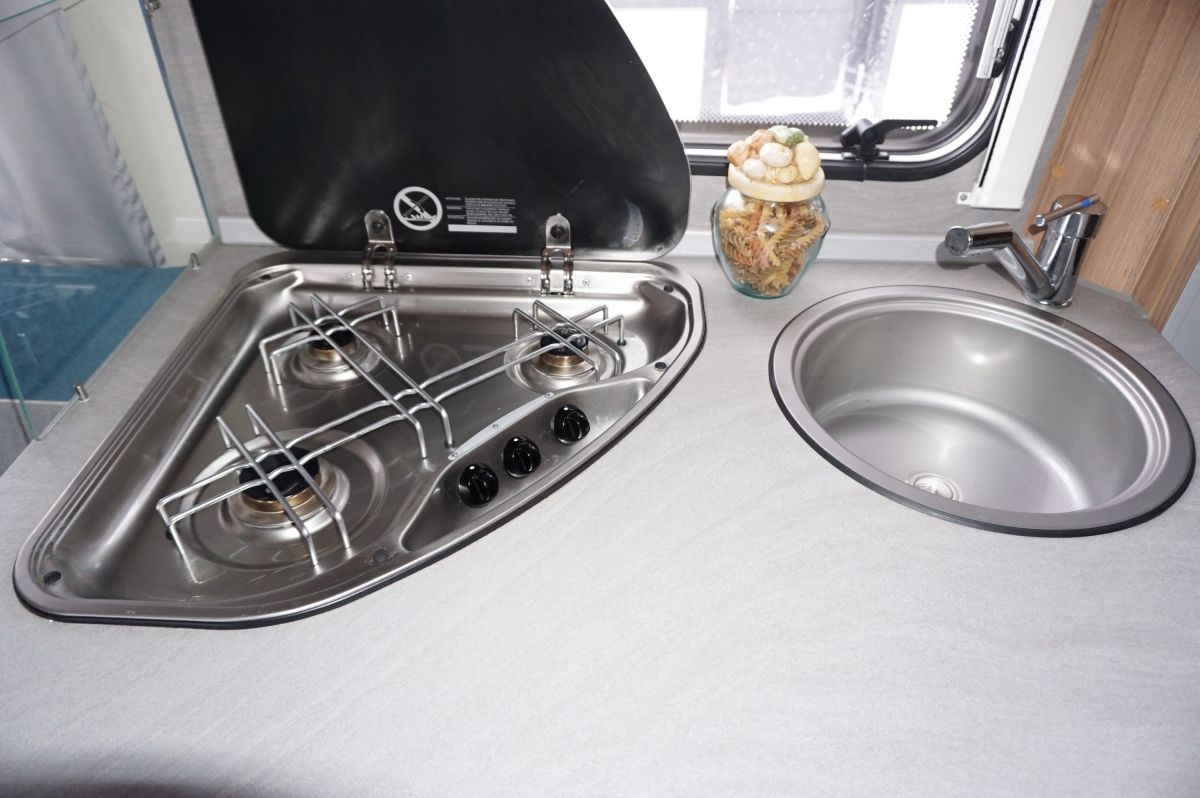 Voorzien van een 3-pits gasfornuis, ruime koelkast en praktische kastruimte – alles wat je nodig hebt om onderweg te koken.