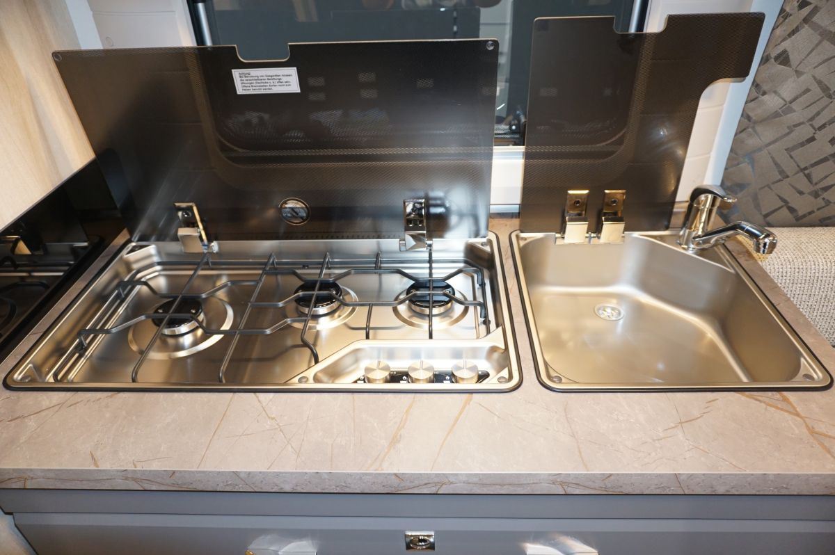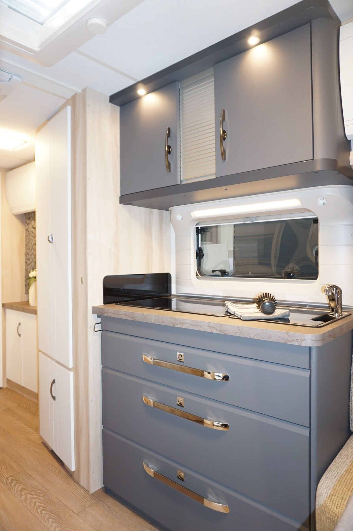 De praktische keuken beschikt over een 3-pits gasfornuis en een extra grote koelkast. Overal in de caravan zijn kastjes voorzien voor al je keukenspullen en bagage.