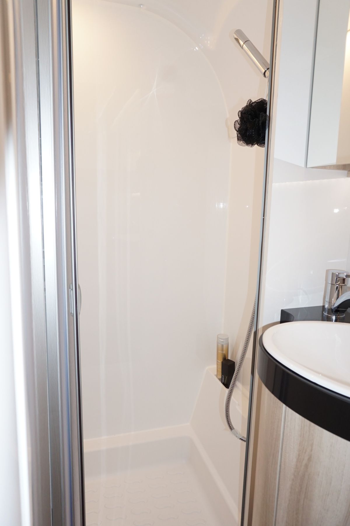 Met een aparte douchecabine en een vast toilet biedt deze caravan uitzonderlijk comfort – net zoals thuis!