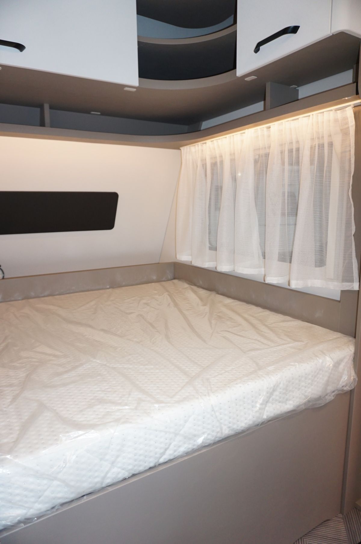 Comfortabel dwars tweepersoonsbed met ruime bergruimte eronder, bereikbaar van binnenuit én via het serviceluik.
