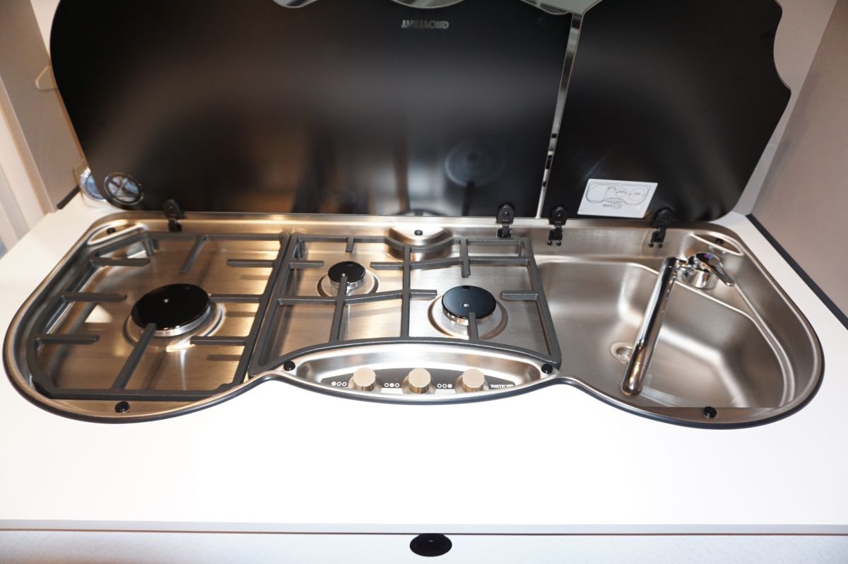 Een volledig uitgeruste keuken met 3-pits gasfornuis, een extra grote koelkast en tal van handige opbergkasten.