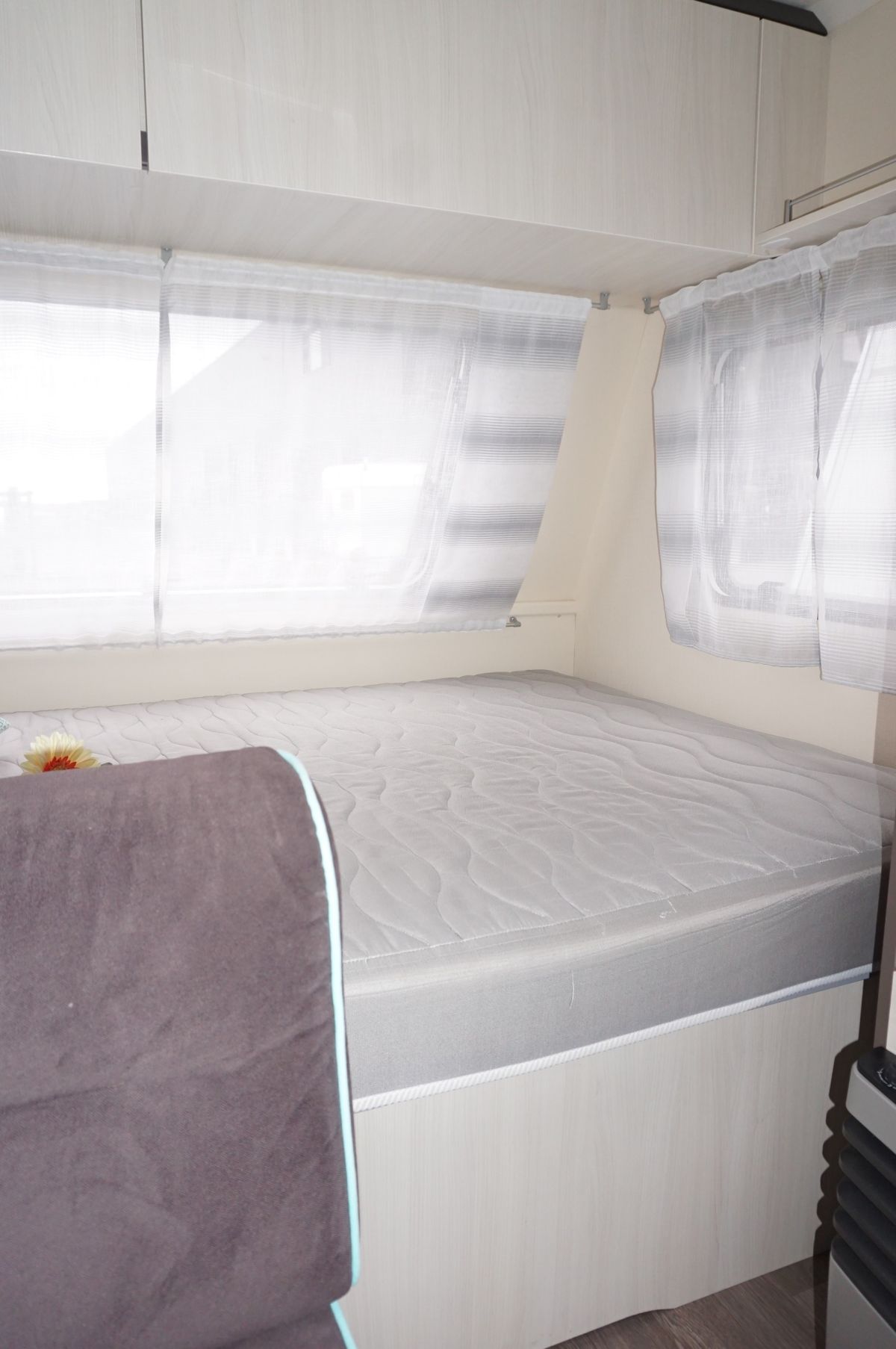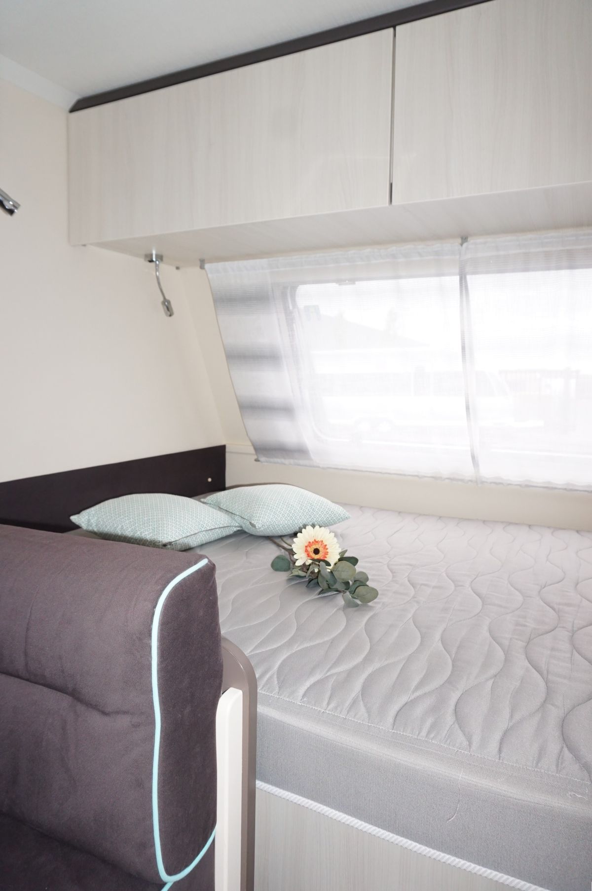 Ruim dwars bed met royale opbergruimte onder het bed, eenvoudig bereikbaar van binnenuit én via het serviceluik buiten.