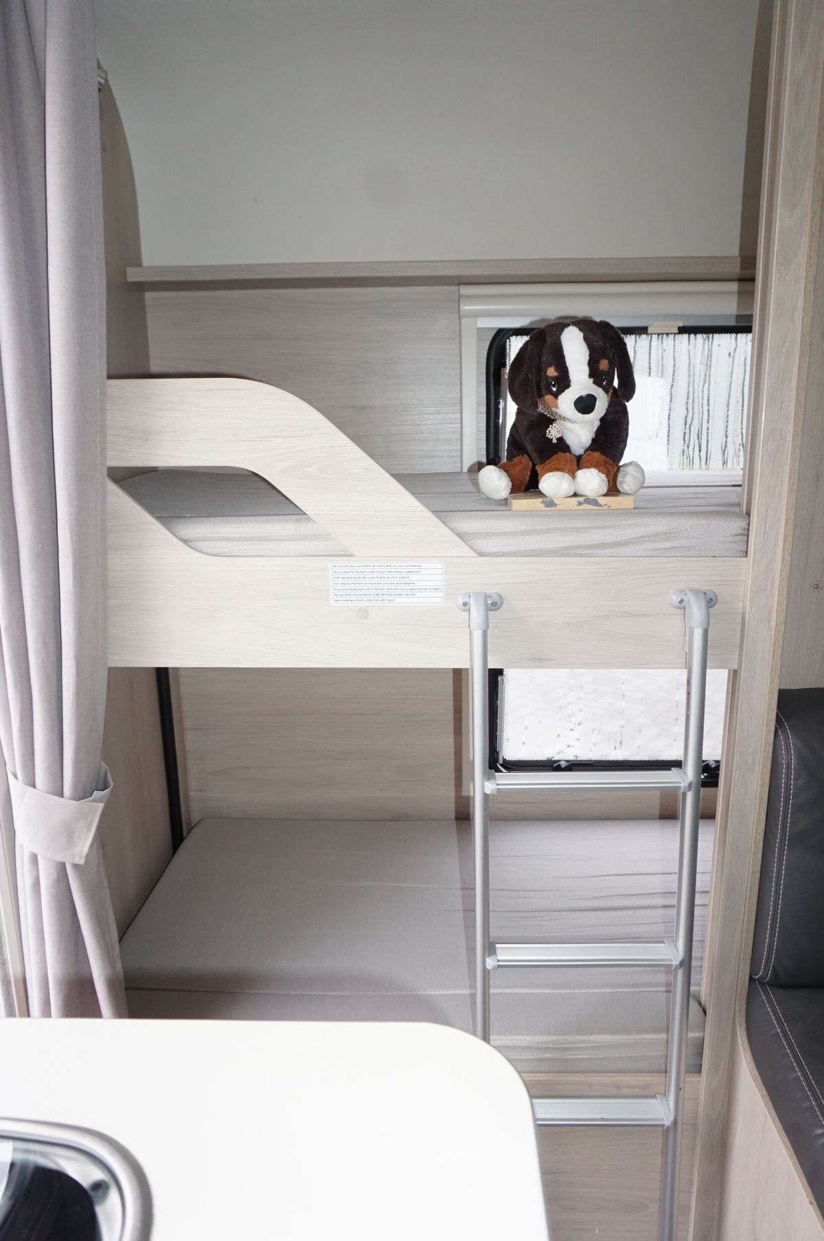 Kindvriendelijke slaaphoek met stapelbed. Het onderste bed is eenvoudig om te vormen tot een grote garage – ideaal voor fietsen of extra bagage.