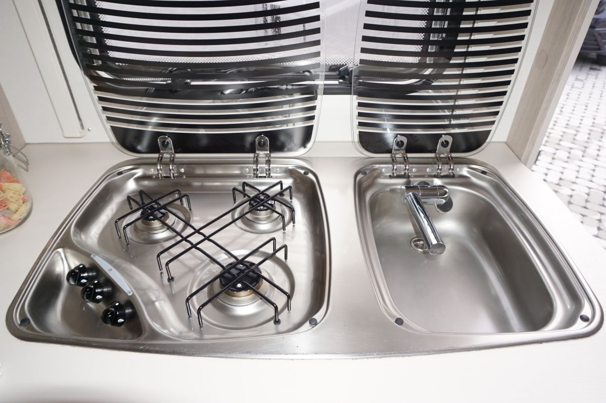 Uitgerust met een 3-pits gasfornuis, een royale ladekoelkast en voldoende opbergruimte voor al je kookbenodigdheden.