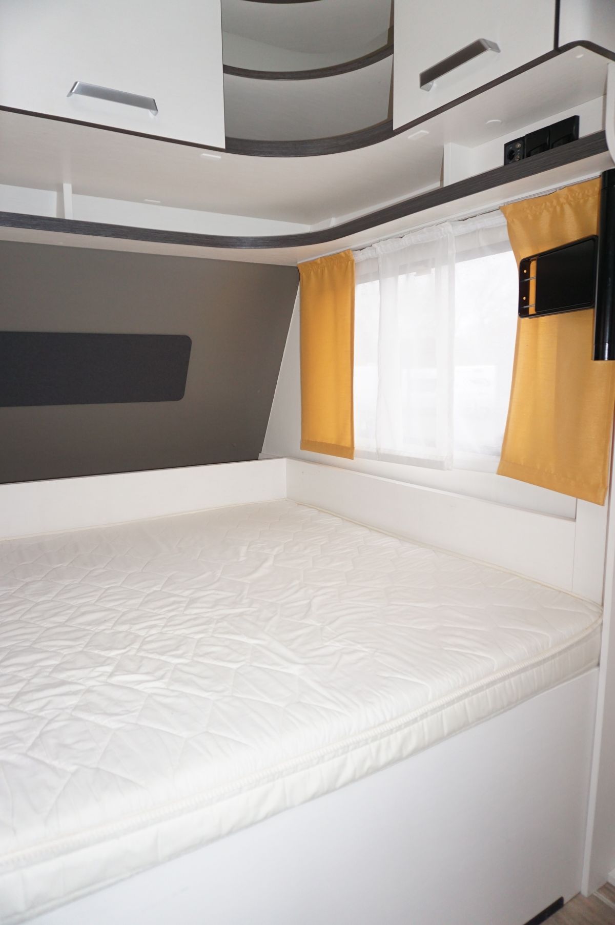 Comfortabel dwars tweepersoonsbed met royale opbergruimte eronder, zowel van binnenuit als via het serviceluik buiten bereikbaar.