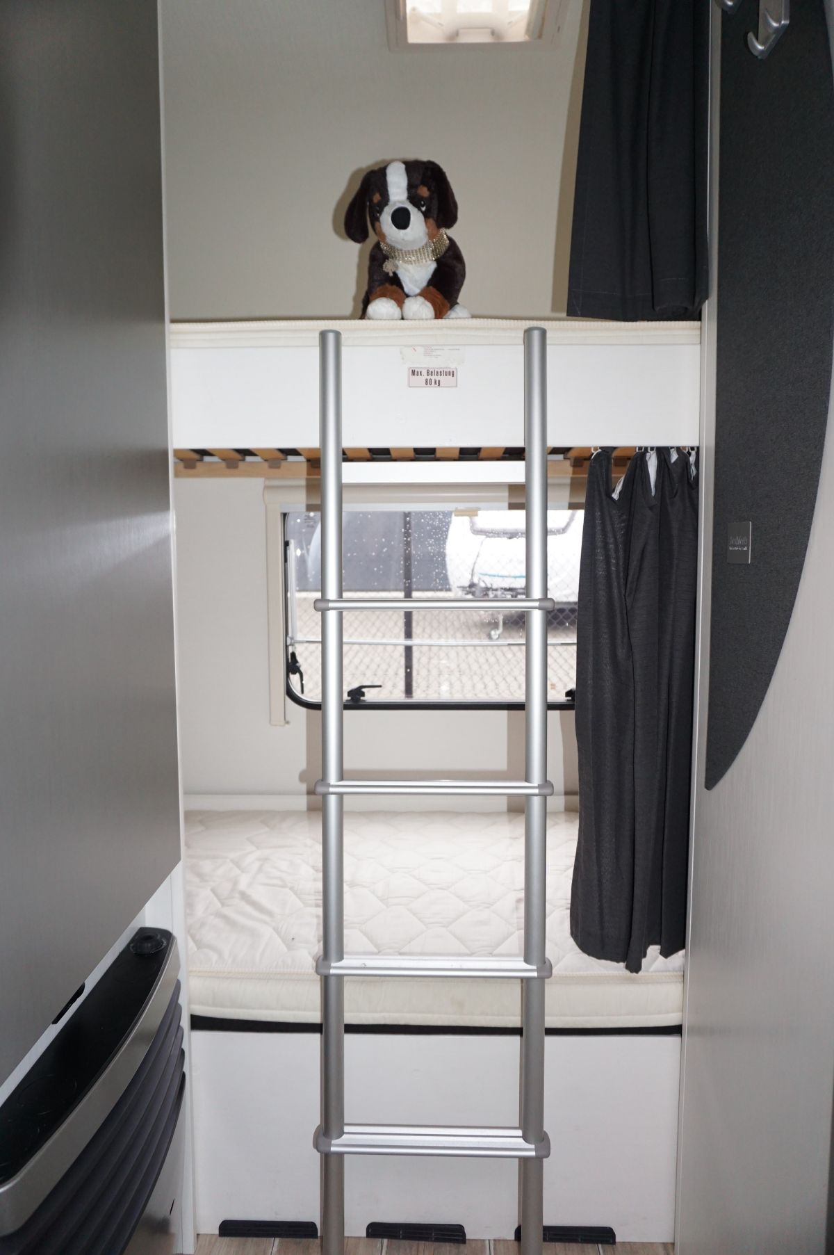 Afsluitbare kinderslaaphoek met stapelbed. Het onderste bed kan eenvoudig worden weggeklapt om een ruime garage te creëren – ideaal voor fietsen, extra bagage of kampeeruitrusting.