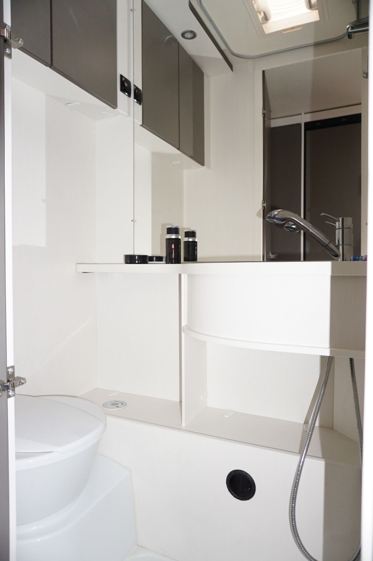 Aparte toiletruimte met vaste wastafel, douche en vast toilet – extra comfort en zelfstandigheid onderweg.